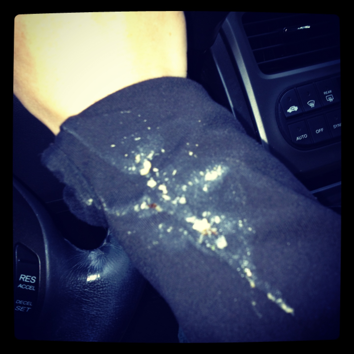 But, while it’s all very good and healthy that I’m carting around a thermos of miso instead of coffee, miso soup is an ugly dribble. It’s one thing to spill coffee on yourself when you’re driving, but if you do it with miso, you look like this: